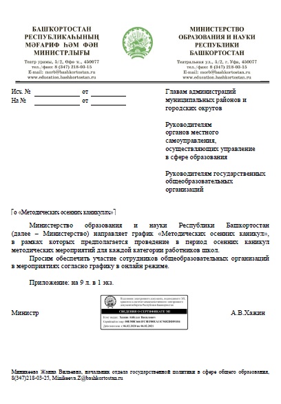 Министерство образования и науки Республики Башкортостан направляет график «Методических осенних каникул», в рамках которых предполагается проведение в период осенних каникул методических мероприятий для каждой категории работников школ.